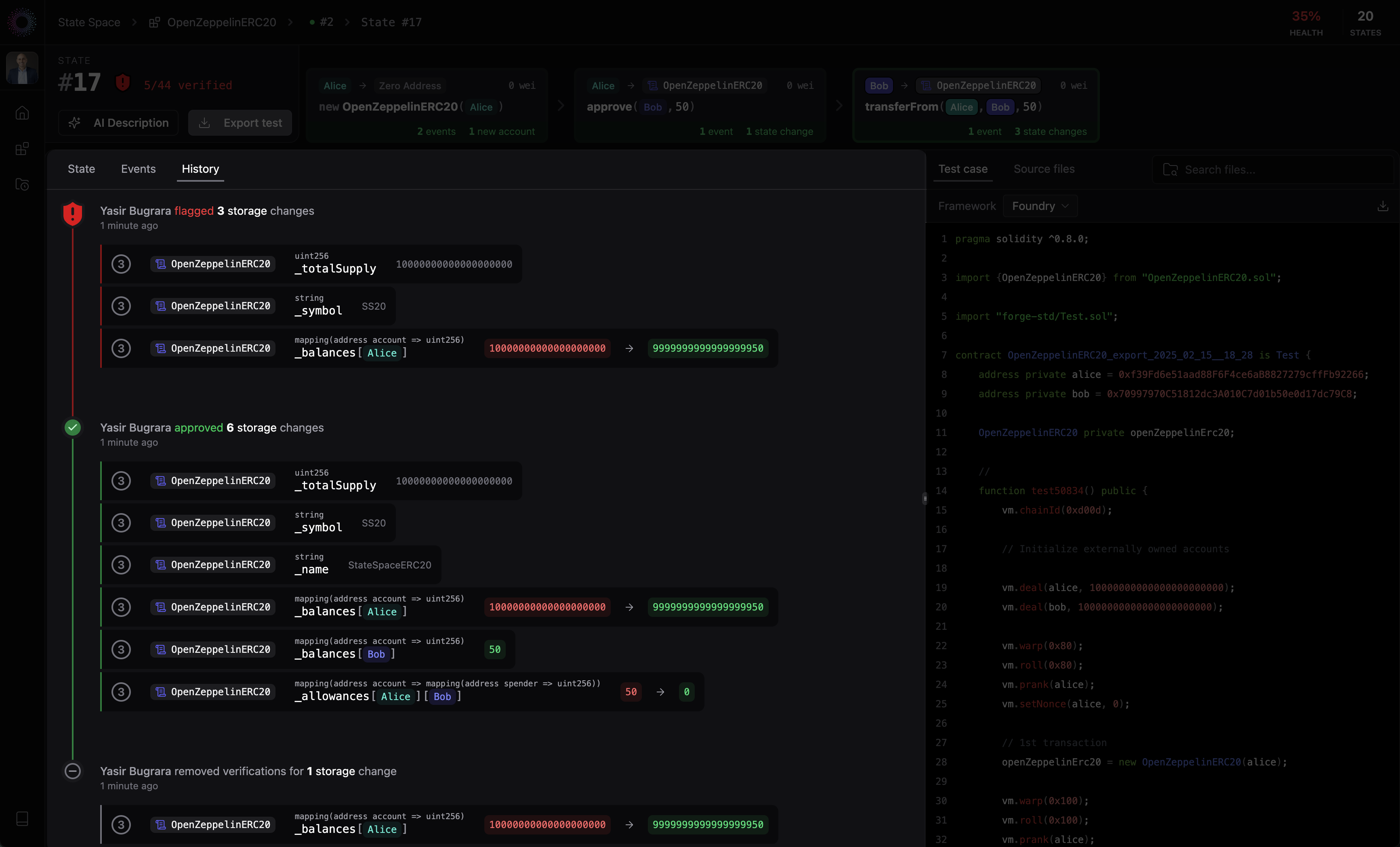 Use an intuitive visual interface to analyze, validate, and certify the protocol behavior. Inspect contract values, storage, balances, and state changes as a timeline across each transaction. Flag behaviors for correctness and unexpected behavior, uncovering edge cases that could impact reliability and security.
