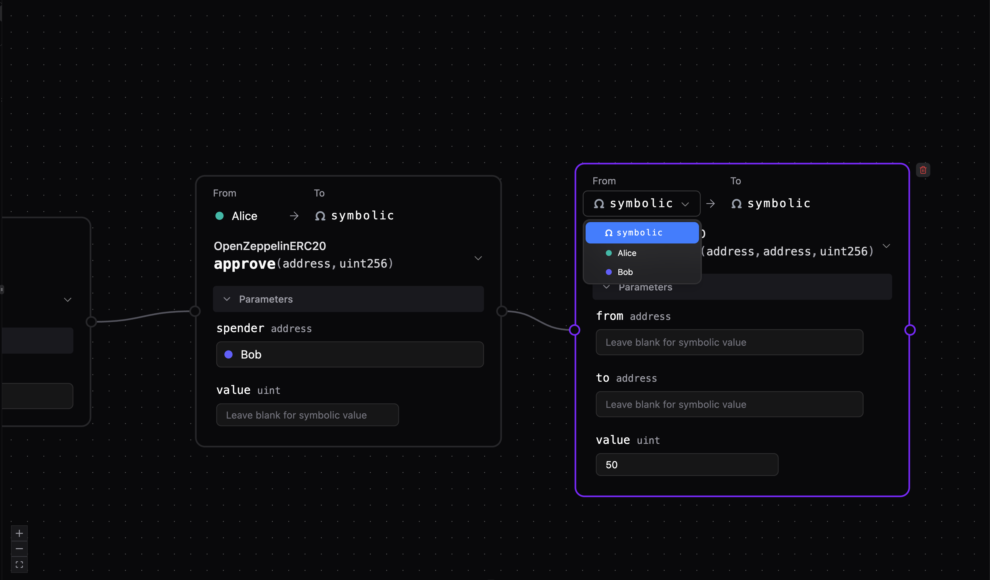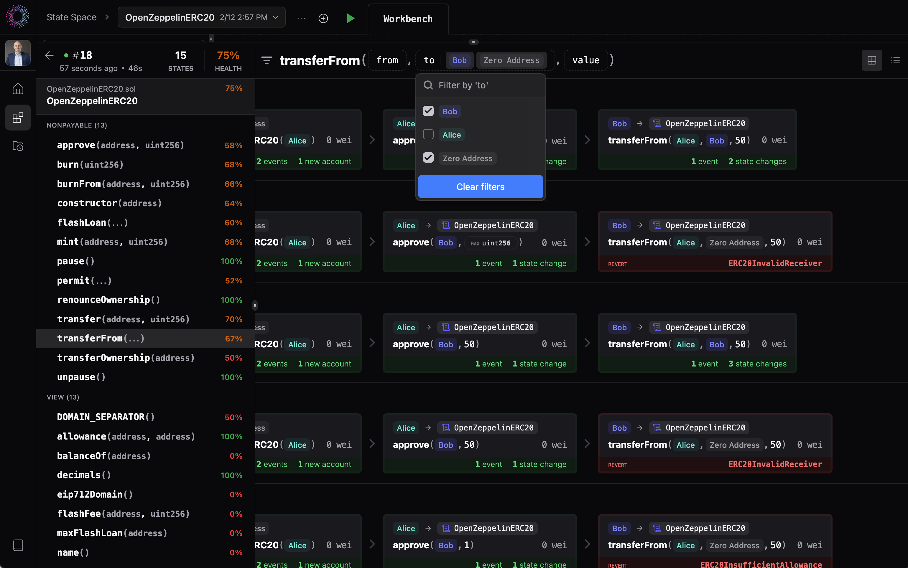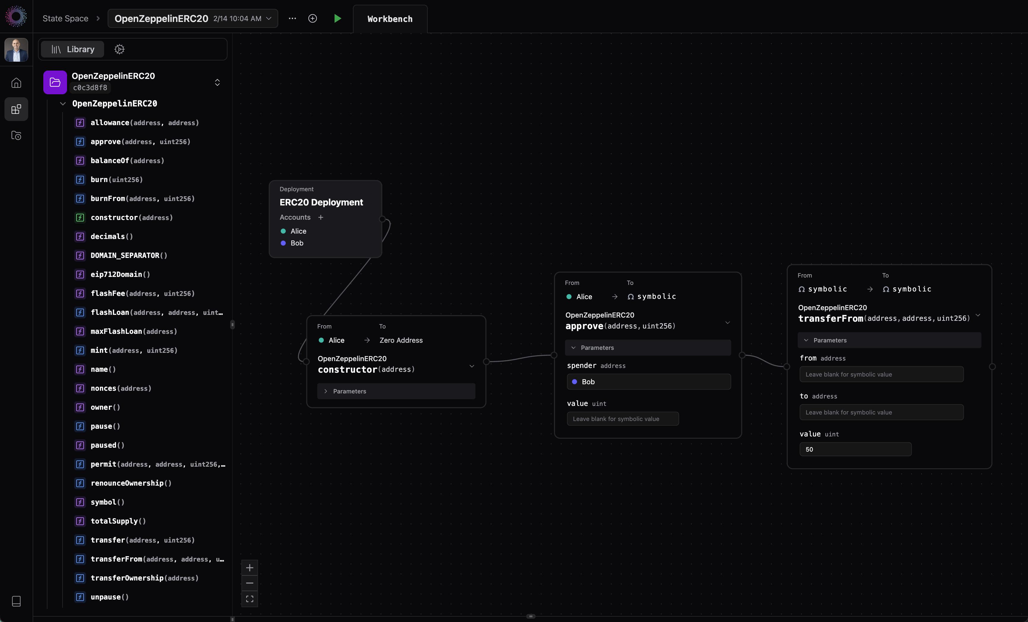 Map end-to-end, multi-contract user flows and interactions from your smart contract code via drag-and-drop, instead of manually hand-crafting test scenarios and edge cases. Explore the state space of any transaction sequence you design.