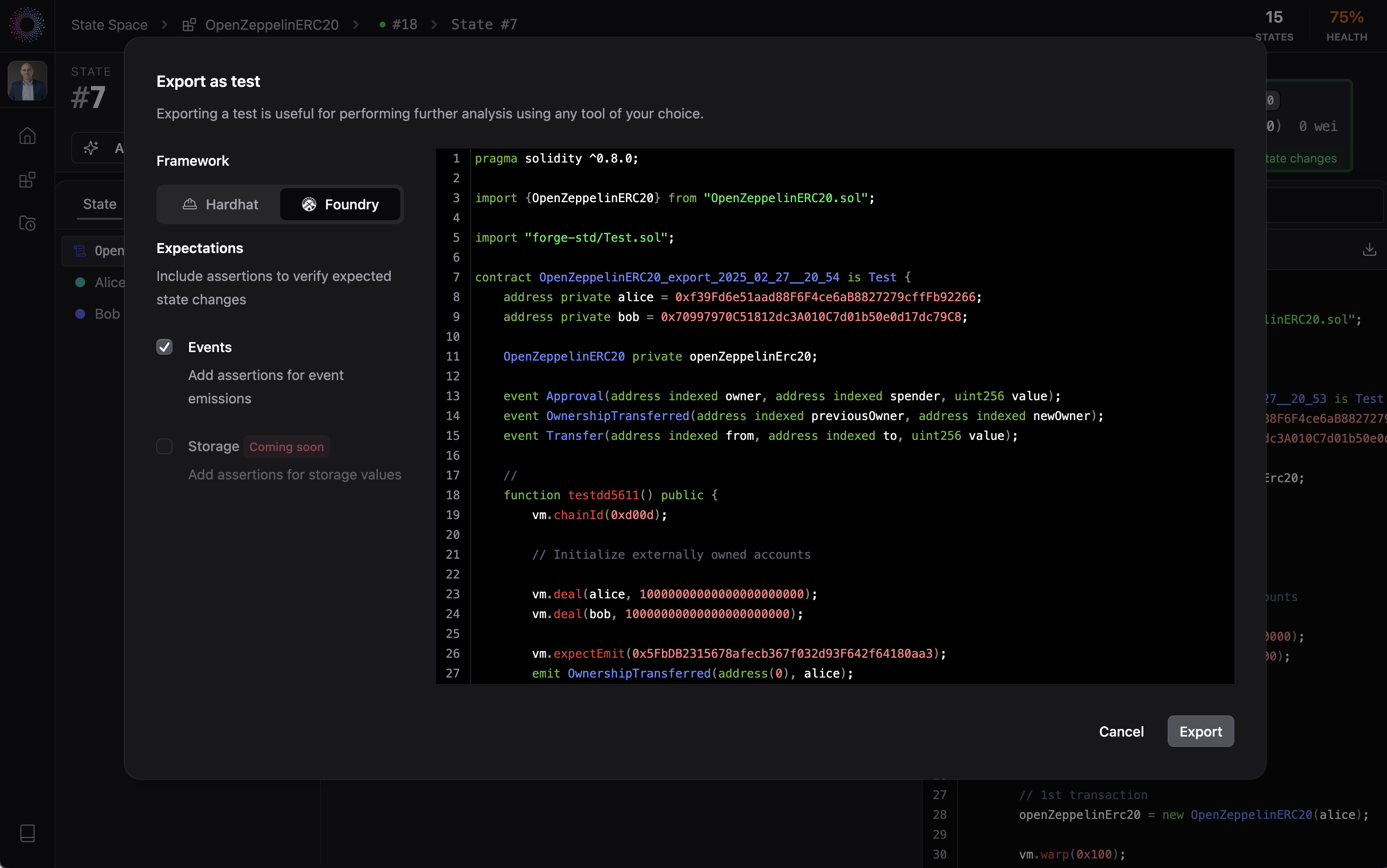 Use the generated state space to export decoded, comprehensive, and fully reproducible Foundry and Hardhat test suites that represent the exact behavior of your code. State Space verifies all output with multiple reference implementations to verify the accuracy of the test suite. Implement a workflow for automated regression test generation to surface the smallest of behavior changes with each code update.